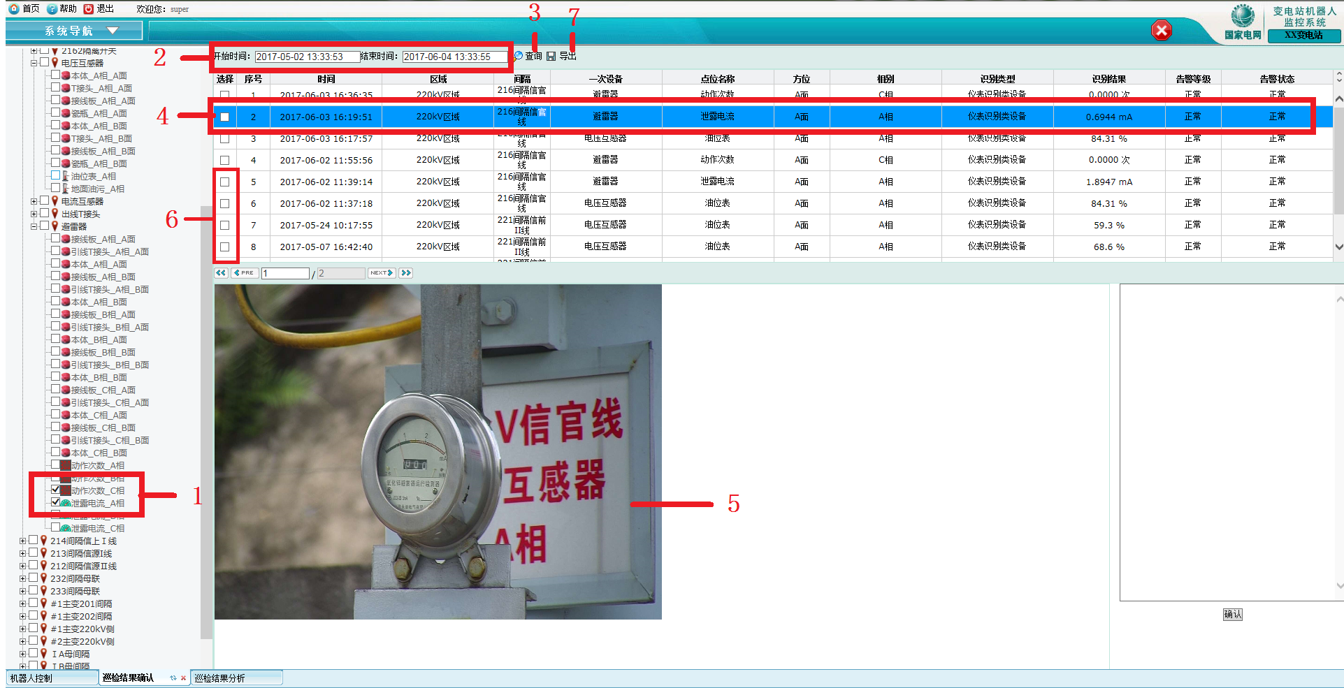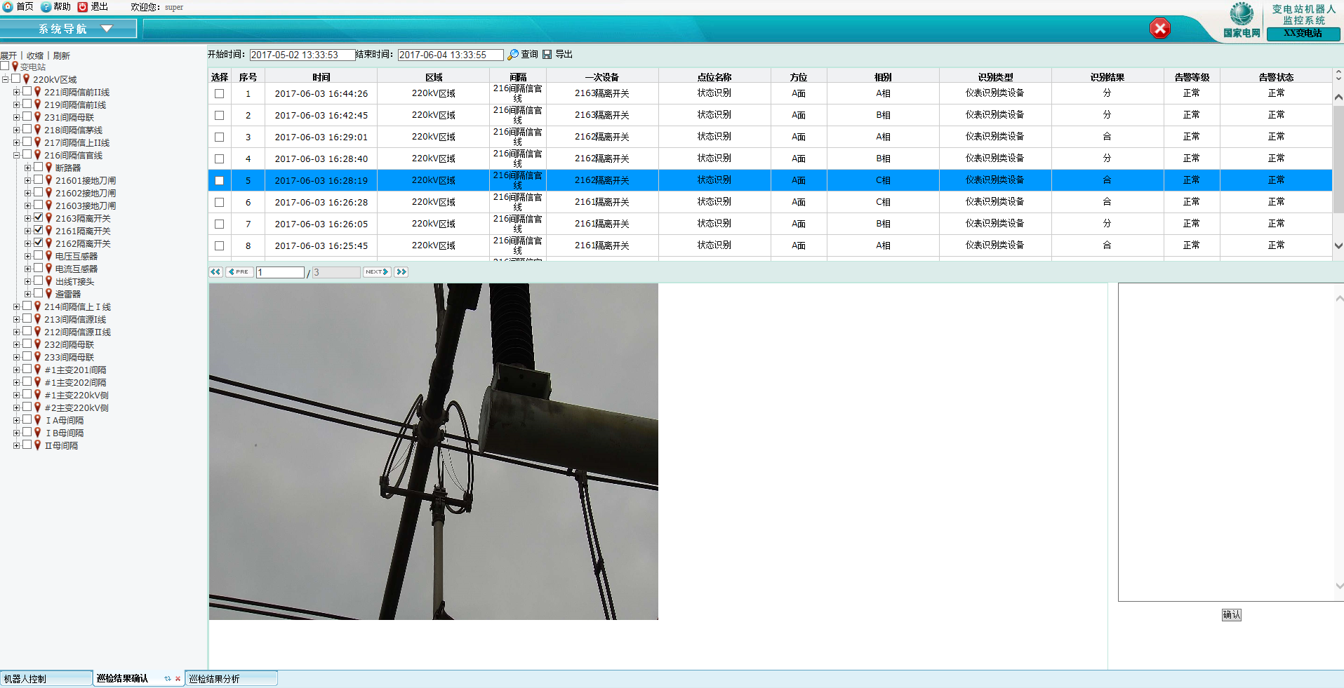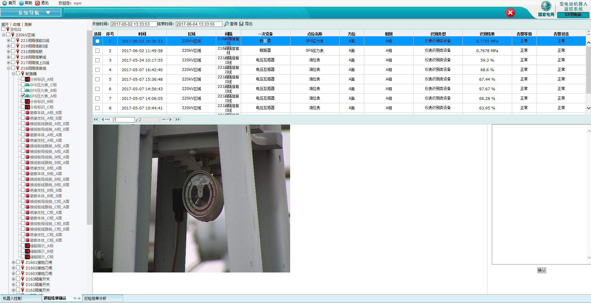 3)點擊『查詢』按鈕實現(xiàn)查詢將顯示所有的巡檢結(jié)果記錄,在下方頁面將顯示所有要搜索的巡檢信息(如巡檢時間、所在區(qū)域、間隔、一次設(shè)備、點位名稱、方位、相別、識別結(jié)果、告警等級、告警狀態(tài));