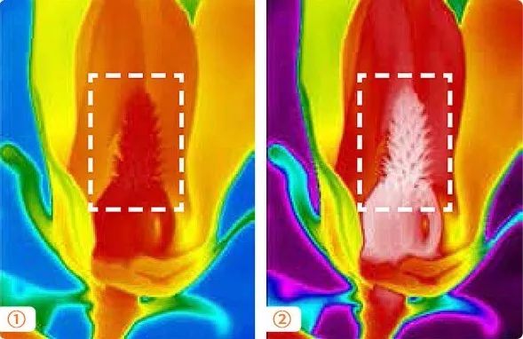 1.熱靈敏度決定熱像儀區(qū)分細(xì)做溫差的能力。同樣情況圖2所用熱像儀的熱靈敏度更低,畫(huà)面清晰顯示花蕊細(xì)節(jié)的溫度分布,而圖1同區(qū)域只能看到一片紅色。