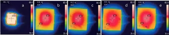 下圖為不同規(guī)格的散熱薄膜材料的篩選對(duì)比,其中a為對(duì)照組,熱源不做任何散熱措施,b~d熱像圖所用散熱材料從上到下的微觀分層為:
