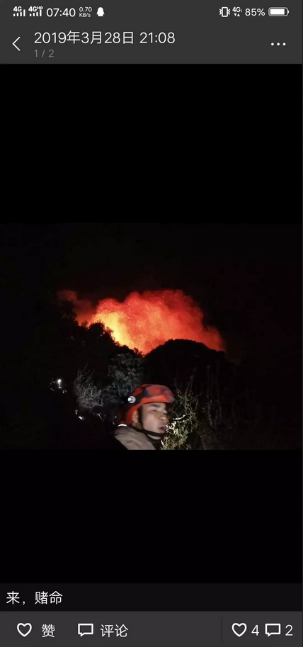 同一時刻,在王佛軍的朋友圈里,黑暗中,山火在身后,向前奔跑的他,匆匆回頭,照片的鏡頭有點糊,“來,賭命”。——這是這位“00”后留給世界的最后一句話。