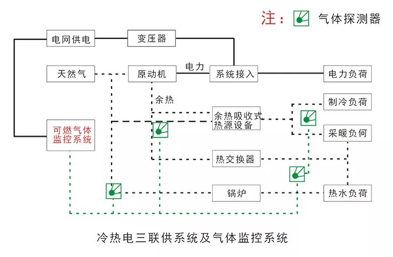 下圖為常規(guī)的冷、熱、電三聯(lián)供系統(tǒng)結合氣體監(jiān)控系統(tǒng)圖,該系統(tǒng)主要由原動機為核心的發(fā)電設備、余熱回收設備、氣體探測器組成,與電網并網運行。