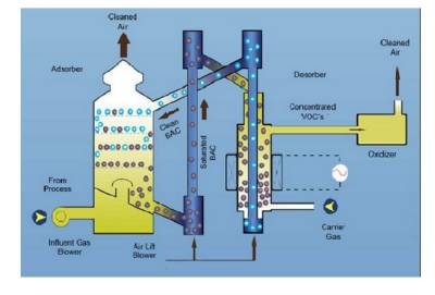 利用吸附劑(粒狀活性炭和活性炭纖維)的多孔結(jié)構(gòu),將廢氣中的VOC捕獲。將含VOC的有機(jī)廢氣通過(guò)活性炭床,其中的VOC被吸附劑吸附,廢氣得到凈化,而排入大氣。