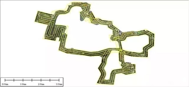 對(duì)于河道等相對(duì)較為狹窄且細(xì)長(zhǎng)的巡查區(qū)域,在進(jìn)行航線規(guī)劃時(shí)可使用航帶飛行模式的規(guī)劃方式,在航點(diǎn)設(shè)置上航點(diǎn)應(yīng)盡量設(shè)置在河道中心上方,以便進(jìn)行通道外擴(kuò)的統(tǒng)一設(shè)置。外擴(kuò)距離的設(shè)置建議延展至河岸5~10米,以方便后續(xù)重建及地圖定位。