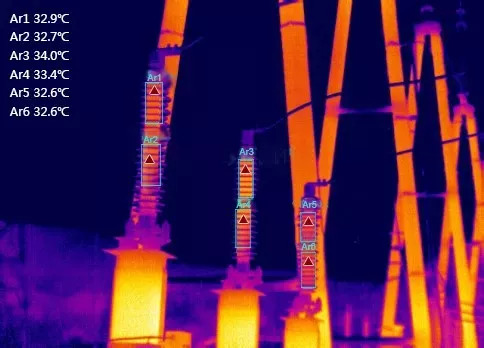 我們來看一個(gè)真實(shí)的案例。某電力公司一線運(yùn)維檢修人員在變電站進(jìn)行紅外精確測溫時(shí),發(fā)現(xiàn)某組避雷器存在微小溫差,如下圖: