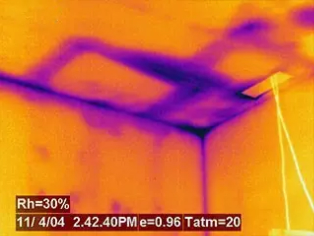 為了加快樓宇的干燥過程,通常需要使用干燥設(shè)備。干燥設(shè)備生成的熱量能夠蒸發(fā)墻壁和其他區(qū)域的水份。仍然潮濕的區(qū)域可以被紅外熱像儀方便地加以檢測(cè),并在紅外圖像中以“冷點(diǎn)”形式出現(xiàn)。